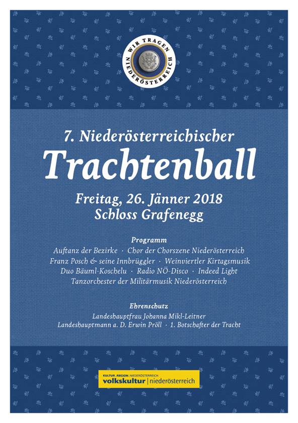 Die Volkskultur Niederösterreich bittet gemeinsam mit den Partnern der Initiative „Wir tragen Niederösterreich“ bereits zum siebten Mal zum Niederösterreichischen Trachtenball, am Freitag, 26. Jänner 2018. Die Landjugend darf als Partner bei diesem Fest natürlich nicht fehlen. Die Landjugend Bezirk Gföhl veranstaltet vor Ort eine Milchbar und schenkt leckere Milchshakes und Shots aus. Hervorragende Ballmusik mit Franz Posch & seinen Innbrügglern, der Weinviertler Kirtagsmusik sowie dem Tanzorchester der Militärmusik Niederösterreich sorgen in den zwei Ballsälen, Auditorium und Reitschule, für ein stets volles Tanzparkett bis weit nach Mitternacht. Zahlreiche Bars und Lounges mit Live-Musik und kulinarischen Angeboten laden zum Flanieren und Verweilen ein. Für die Jugend und jung Gebliebene bringt die Radio Niederösterreich-Disco heiße Rhythmen auf das Parkett. Die liebevoll geschmückten Ballsäle und die prachtvollen Trachten der Gäste sorgen für das besonders festliche Ambiente des Balls. Das Rahmenprogramm wartet mit einem großen Auftanz der Bezirke, Tanzvorführungen des Tanzforums Niederösterreich sowie einem mehr als hundertköpfigen Projektchor der Chorszene Niederösterreich auf. Ballbesucher mit einer Tischkarte erwartet ein köstliches Spezial-Menü serviert vom Team von Toni Mörwald. Die Volkskultur Niederösterreich und die „Wir tragen Niederösterreich“-Partner veranstalten diesen Ball, um die Vielfalt der Regionen und die niederösterreichischen Trachten in einem besonderen Rahmen zu präsentieren und wünschen eine wunderbare Ballnacht!