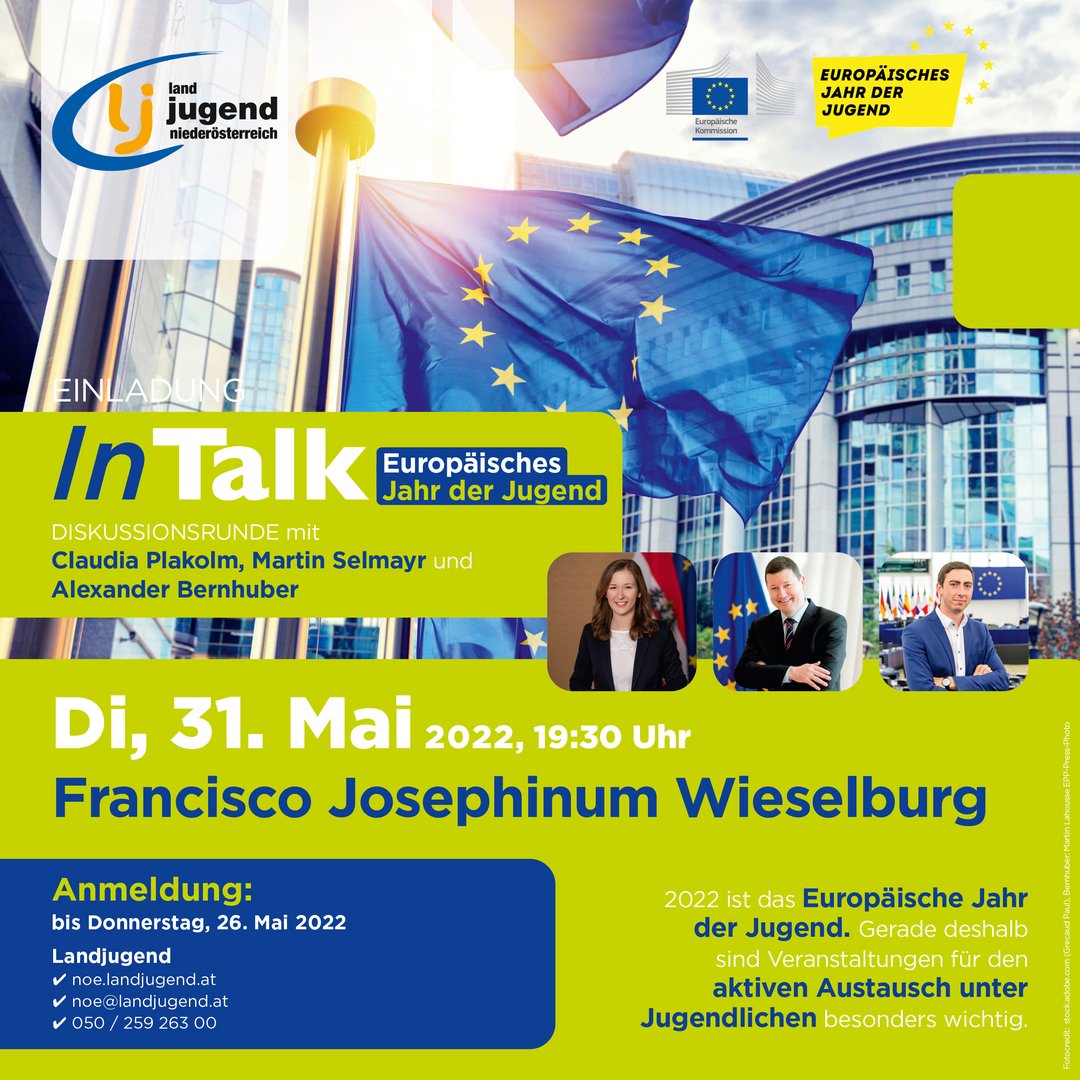 Am 31. Mai gibt es im Francisco Josephinum Wieselburg eine sehr spannende Veranstaltung zum Thema! Im Rahmen von "Landjugend InTalk" werden wir mit Jugend-Staatssekretärin Claudia Plakolm, dem EU-Botschafter in Österreich Martin Selmayr und österreichs jüngstem EU-Parlamentarier Alexander Bernhuber über die Jugend in Europa diskutieren. Diese einmalige Gelegenheit, mit Entscheidungsträger:innen ins Gespräch zu kommen, solltest du dir auf keinen Fall entgehen lassen!