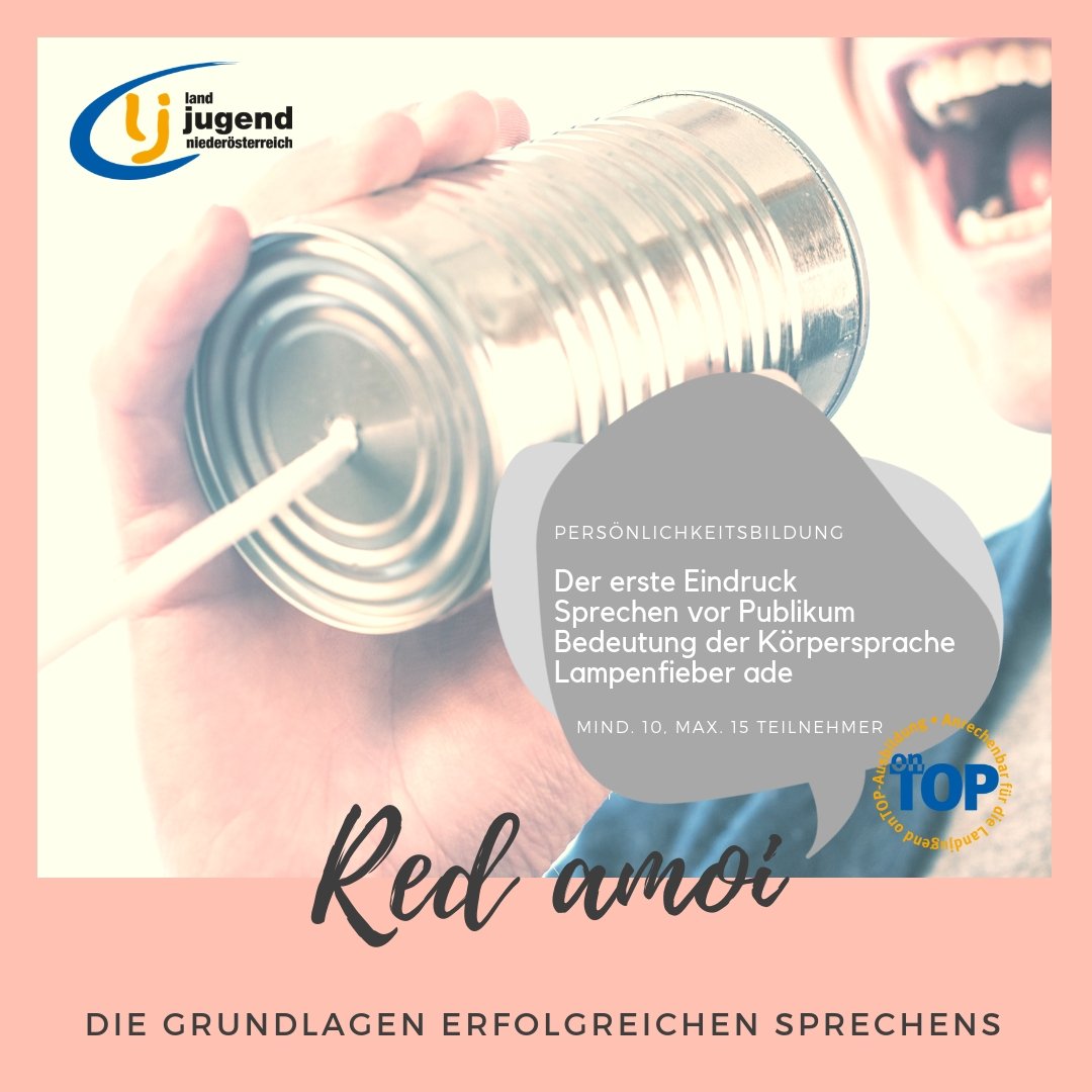 Das Rhetorik Seminar "Red' amoi" ist der ideale Einstieg für alle Landjugend Mitglieder. Die Tool Box Trainer, das sind aktive Landjugend Mitglieder mit der Ausbildung für Rhetorikseminare, erkären auf einfache Art und Weise den richtigen Zugang zum Reden! Reden heißt Meinung vertreten, dieses wird in einem 5-stündigen auf einfache Art und Weise den Rede-Startern beigebracht! Inhalte *Grundlagen erfolgreicher Kommunikation *Der erste Eindruck und Möglihckeiten seiner Gestaltung *Sprechen vor Publikum: die rhetorische Grundhaltung *Die Bedeutung von Körpersprache in der Kommunikation *Richtiger Umgang mit Lampenfieber und fehlendem Selbstbewusstsein TeilnehmerInnen: mind. 10, max. 15 TeilnehmerInnen Dauer: 5 Stunden / 5 LAZ-Punkte ReferentInnen: Tool Box Trainer der Landjugend Niederösterreich Material: Beamer mit Lautsprecher, Leinwand, Flipchart Bildungsbeitrag: Ca. 600 €, Refundierung bis zu 40% der ReferentInnenkosten Auffrischungskurs jederzeit buchbar bei cornelia.elser(at)lk-noe.at