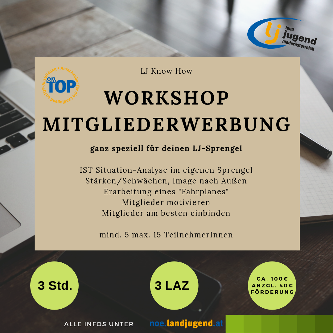 LJ Know How Ihr braucht Unterstützung und Ideen zum Thema "Mitglieder gewinnen" und/oder "Mitglieder motivieren"? Nutzt das Angebot für DEINEN Sprengel! Der Workshop wird speziell auf euren Sprengel zugeschnitten. Inhalt: * IST Situation-Analyse im eigenen Sprengel * Stärken/Schwächen, Image nach Außen * Erarbeitung eines gemeinsamen, maßgeschneiderten Fahrplanes * Wie motivieren wir unsere Mitglieder? * Wie binden wir unsere Mitglieder am besten ein? Hard facts: Teilnehmer: mind. 5, max. 15 Teilnehmer Dauer: 3 Stunden; 3 LAZ Punkte (onTOP) Trainer: Landjugendreferenten Material/Räume: Flipchart, Raum mit genügend Platz zum Ausarbeiten Bildungsbeitrag: € 100,00, abzgl. € 40,00 Förderung Workshop Mitgliederwerbung buchbar bei eurer Bildungsplanungssitzung im Herbst oder unter cornelia.elser(at)lk-noe.at
