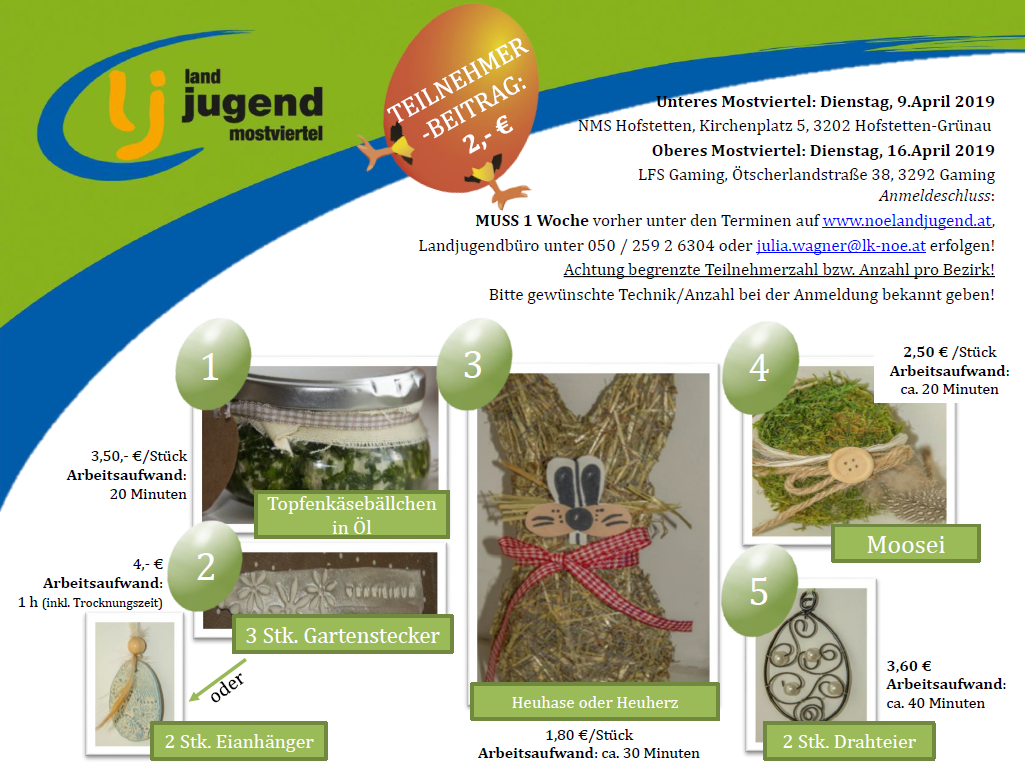 Jährlich vor Ostern findet sich die Landjugend Mostviertel zusammen und veranstaltet mit Hilfe der Betreuungslehrerin Sylvia Schoder einen Kreativabend im unterem und oberem Mostviertel. "Alles rund um Ostern!" gibt es dann zum basteln, fertigen, probieren und kochen! Heuer konnten die Teilnehmer aus einem vielfältigen Angebot auswählen. Vom Heuhasen, über Gartenstecker bis hin zu Drahteiern und Topfenkäsebällchen konnte jeder sein persönliches Geschenk fertigen & Ideen sammeln. Du hast noch Lust auch dabei zu sein? Dann schau vorbei am 16.April findet der 2.Kreativabend in der LFS Gaming statt. Alle Infos findest du bei der Anmeldung. Neugierig auf Bilder? - Hier geht's zur Galerie!