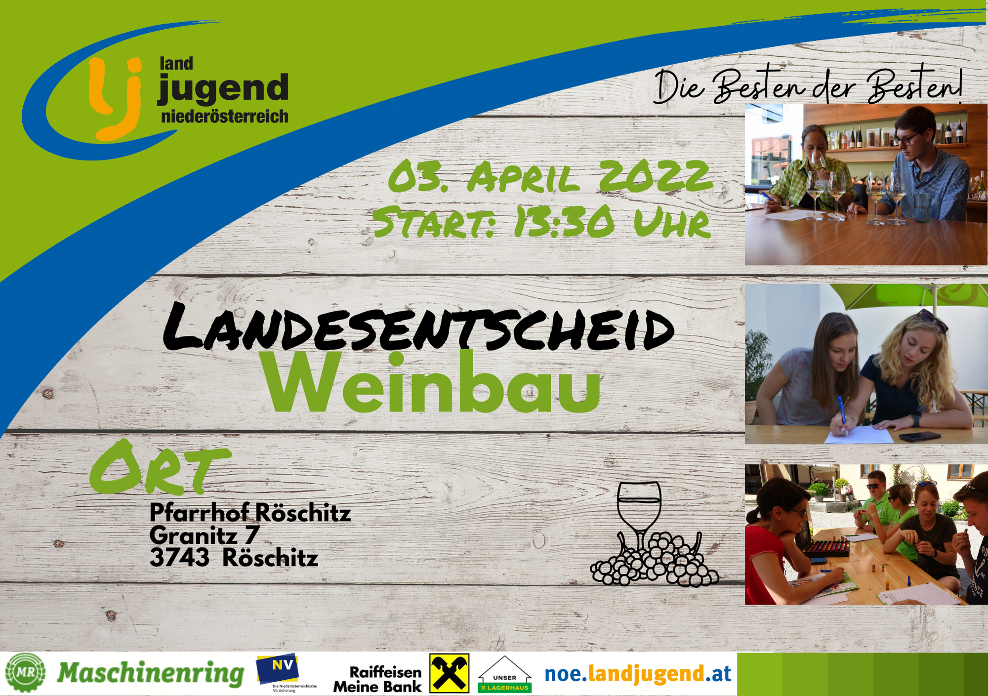 Am 03. April 2022 ist es wieder soweit und ihr könnt euch beim diesjährigen Landesentscheid Weinbau dem Produkt Wein stellen. Die Winzerhöfe in Röschitz öffnen ihre Tor und trefft dort auf eure Mitstreiter*innen und stellt euer Wissen unter Beweis!