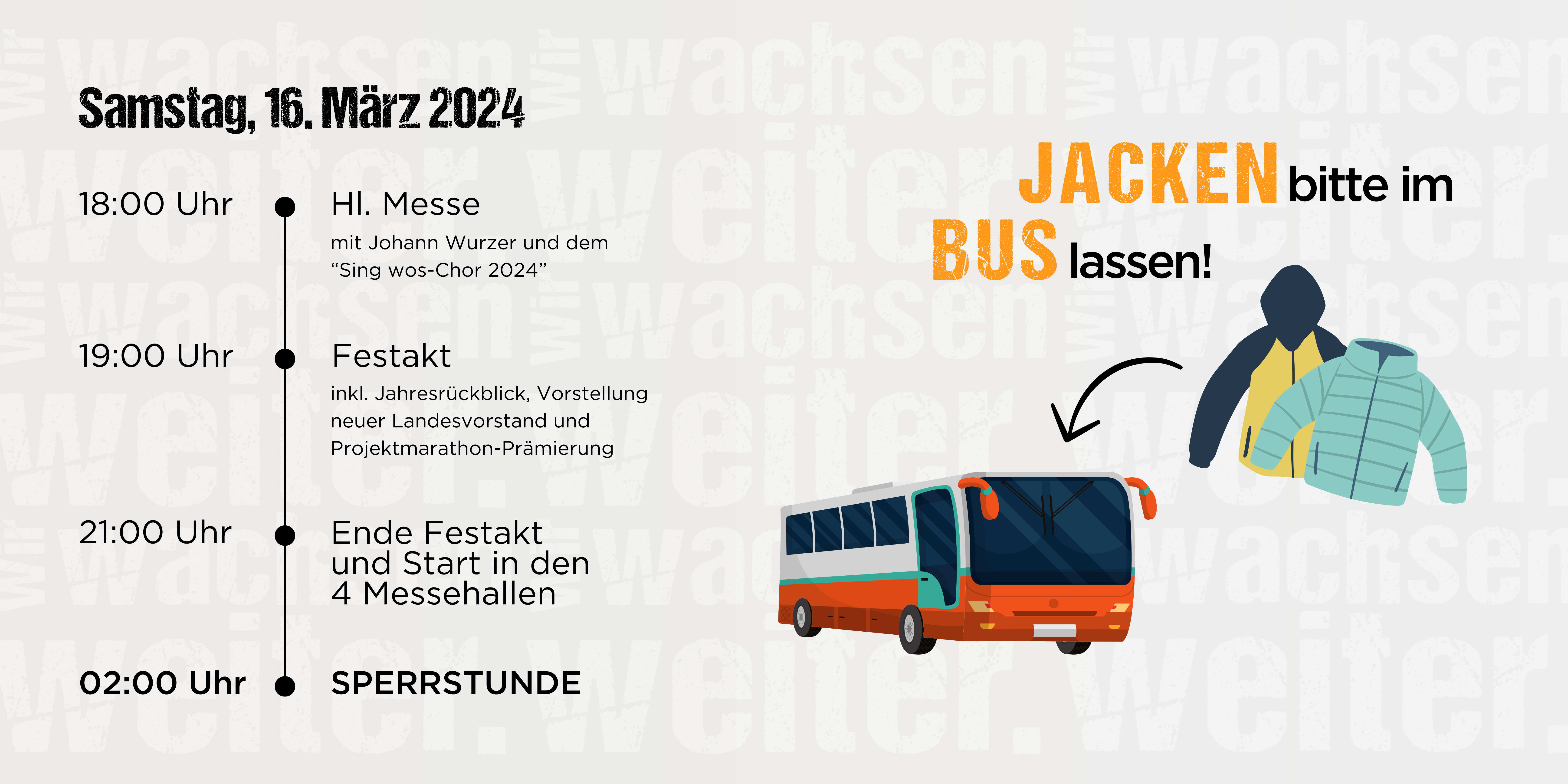 Um euch einen reibungslosen Ablauf und keine Wartezeiten bei der Garderobe zu garantieren, bitten wir euch eure Jacken in euren Bussen/Autos zu lassen!