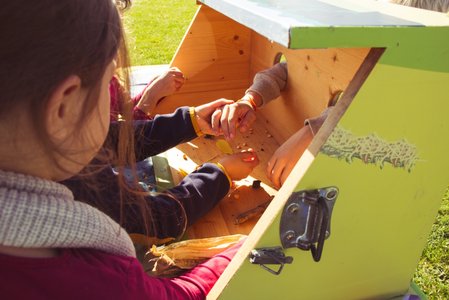 Die Kinder stecken ihre Arme in die Tastbox und bekommen unterschiedliche landwirtschaftliche Gegenstände in die Hand. Sie versuchen möglichst viele nur durch Tasten zu erkennen.