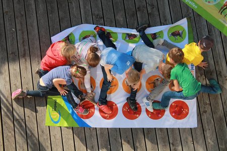 Arme und Beine werden entsprechend einer Anweisung auf Symbolen einer Spielfläche platziert. Geschicklichkeit ist gefragt.